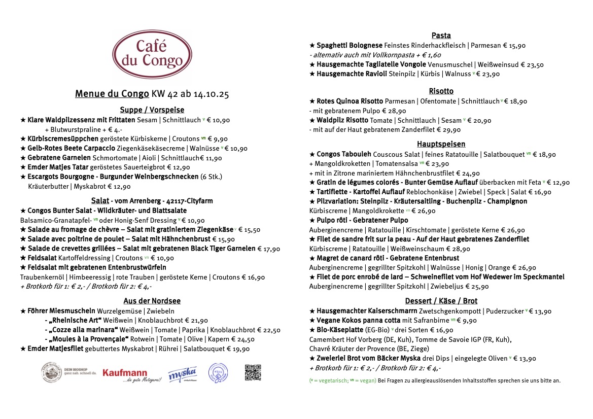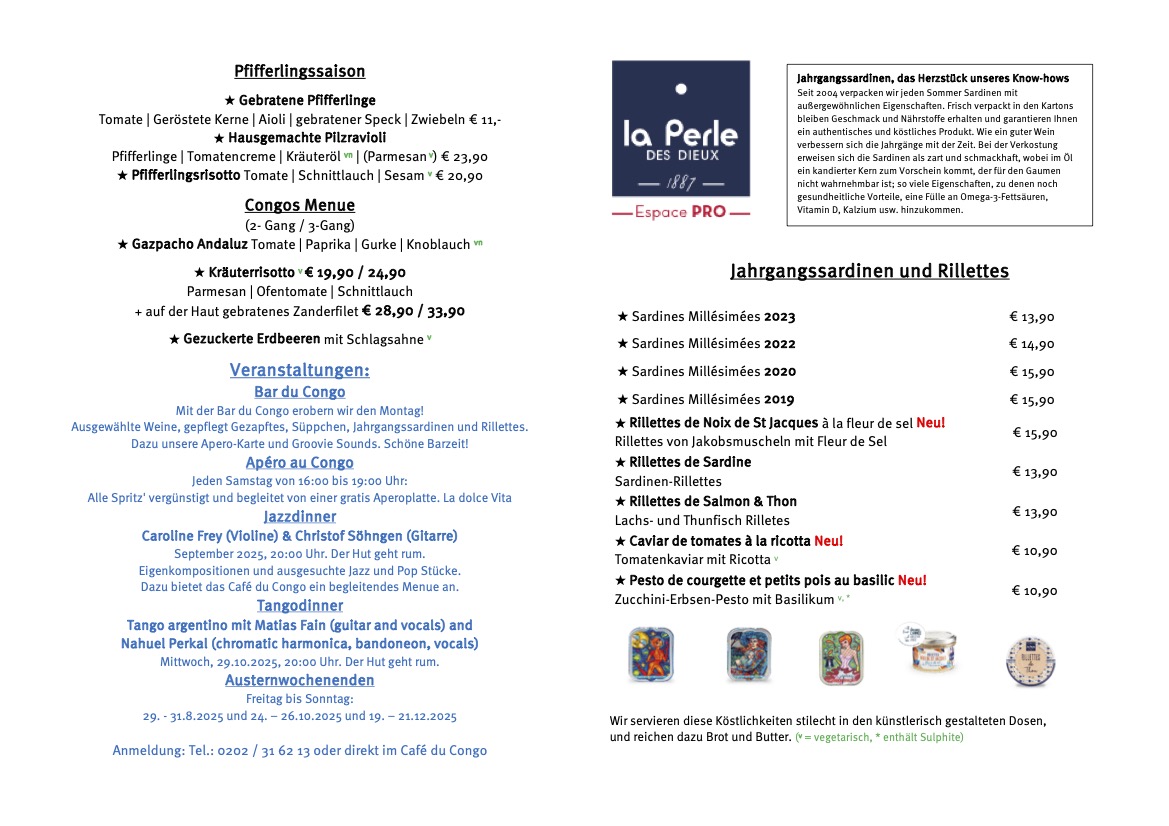 Welcome to Café du Congo, a charming modern European restaurant nestled in the historic Louisenviertel of Wuppertal. This cozy café boasts a delightful menu that captures the essence of contemporary culinary artistry. Begin your culinary journey with the enticing Kichererbsensticks or savor the exquisite Jahrgangssardinen. The pasta and risotto options are particularly noteworthy, expertly prepared to please both palate and eye.